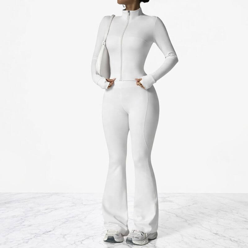 AeroFlare – Hurtigtørkende treningssett for kvinner med slim fit-jakke og utsvingte tights for yoga, trening og hverdagsbruk